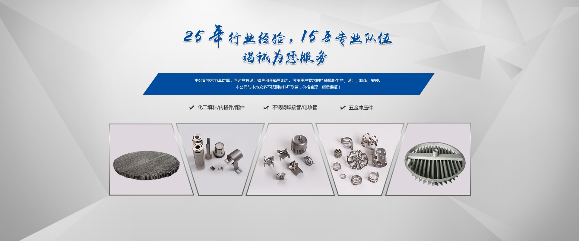嘉興市久達(dá)不銹鋼有限公司原海鹽中晟不銹鋼有限公司,本公司是全國化工行業(yè)和中國石化總公司推薦新型填料、塔內(nèi)件及配件產(chǎn)品的專業(yè)生產(chǎn)廠。2009年建成標(biāo)準(zhǔn)化廠房,生產(chǎn)能力得到進(jìn)一步的提升,效率也更加高效。散堆填料采用高速?zèng)_床一次成型技術(shù)生產(chǎn)。